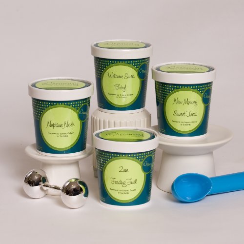 4 pints of delicious gourmet gelato flavors, each named with a special New Baby title. Each flavor is hand made with the finest of specialty ingredients, sure to delight all ice cream lovers. Flavor Titles: "Welcome Sweet Baby!" - Hazelnut, "Naptime Nosh" - Chocolate Chip, "New Mommy Sweet Treat" - Mocha, "2am Feeding Fuel" - Pistachio